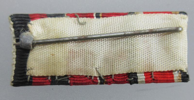 A nice, used condition, German three medal ribbon bar for the 2nd Class Iron Cross, Russian Front Medal and the Sudetenland Medal. To the reverse the bar still retains its attaching pin.
