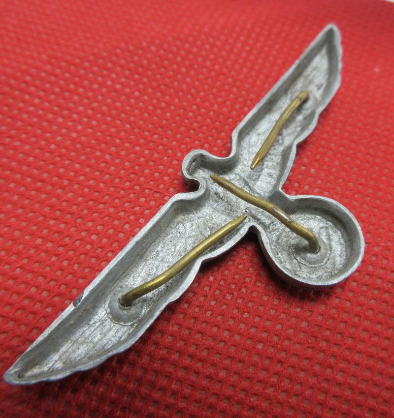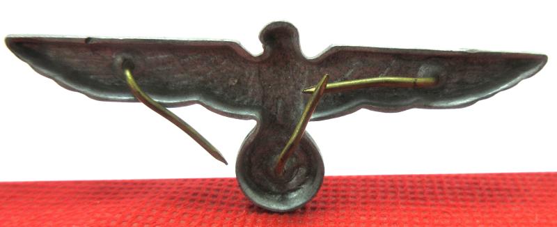 A nice, used condition Army visor cap eagle. Shows some wear and still retains all 3 attaching pins.
