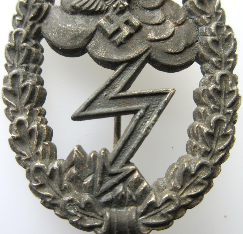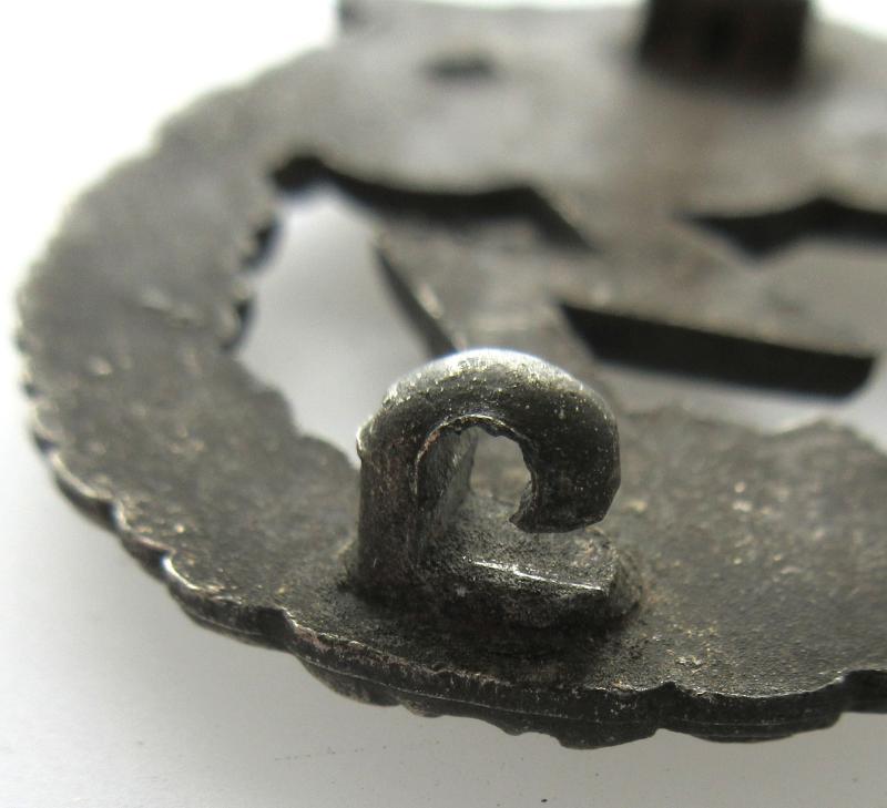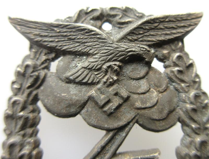 A used condition, Luftwaffe Ground Assault badge. A non maker marked badge but this zinc made type can be attributed to the maker Arno Walpach. Overall in a used a worn condition.