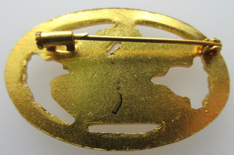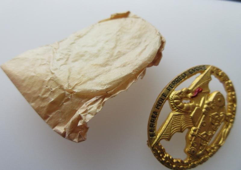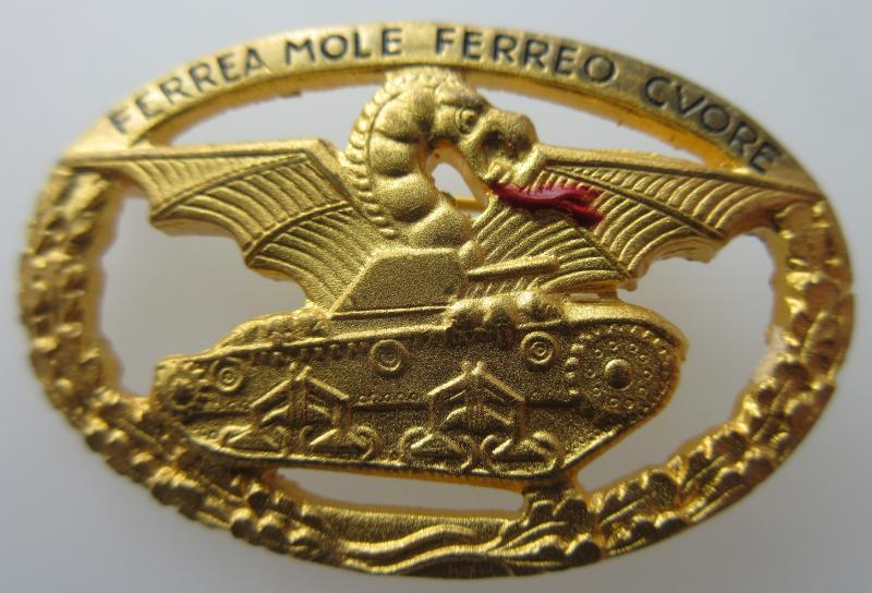A near mint, WW2 Italian Tank Commanders badge. Made of bronze gilt with red and black enamels, with a dragon hovering over a tank. Still retains its attaching pin and original packaging.