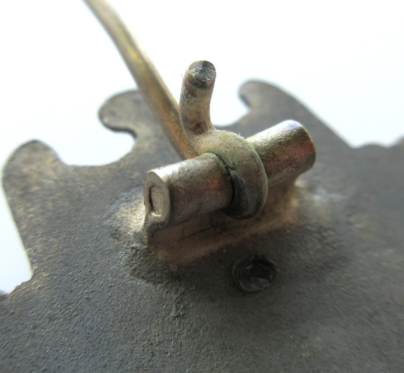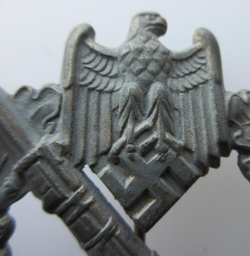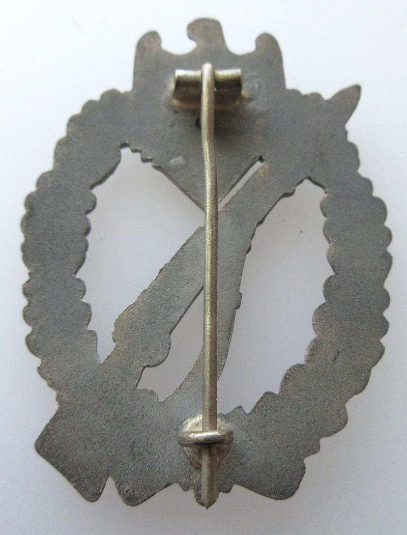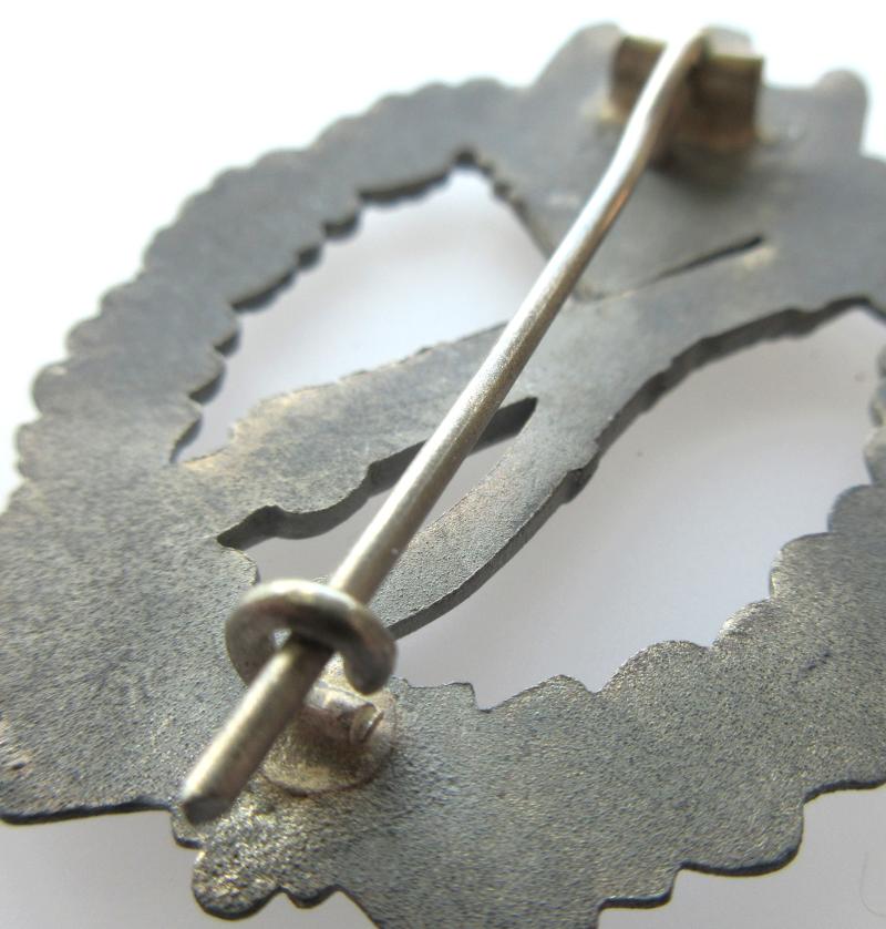 A very nice, unmarked Infantry Assault badge. Shows some slight wear but otherwise fine. Still retains attaching pin and catch.