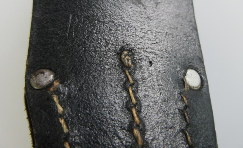 A very nice condition, K98 bayonet frog. It still retains it's cavalry strap and you can still make out the RBnr issue number on the back.