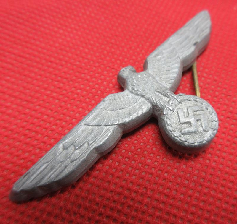 A nice, used condition Army visor cap eagle. Shows some wear and still retains all 3 attaching pins.