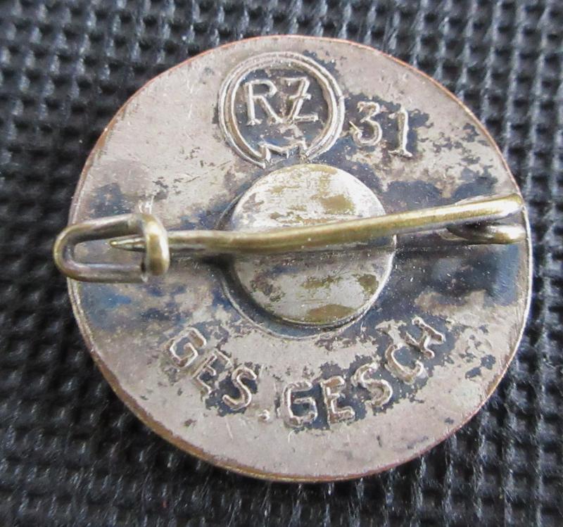 A very nice, hard to find maker, early NSDAP party badge. Good condition with no chips or cracks to the enamelling. Still retains its attaching pin and is marked RZM 31 for the maker Karl Pfohl, Pforzheim